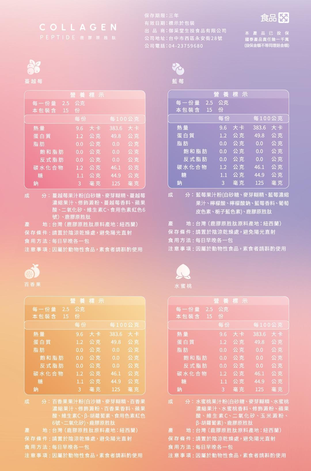 品名:鹿膠原胜肽(蔓越莓、百香果、水蜜桃、藍莓)